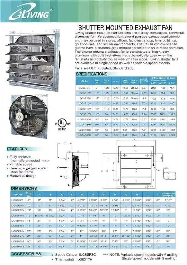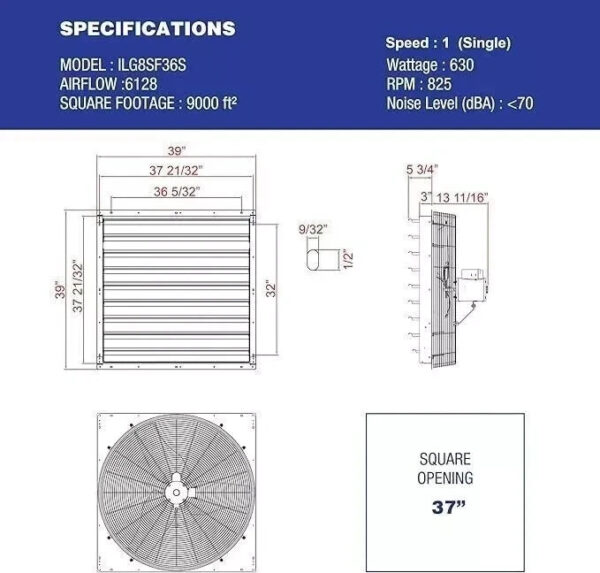 - “POWERFUL AND EFFICIENT: Small but mighty, you’ll enjoy the power and efficiency of iLiving’s Shutter Exhaust Fan. The 36-inch runs onstandard 120 volts at 1/2 HP, 6.00 amps with 825 rotations per minute, cooling and ventilating an area of 6128 cubic feet per minute!”