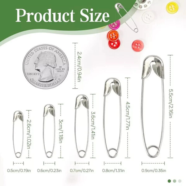 - Safety Pins: You will receive 250pcs/box large safety pins, five sizes: 55x9mm/2.16×0.35inch, 45x8mm/1.77×0.31inch,36x7mm/1.41×0.27inch,30x6mm/1.18×0.23inch,26x5mm/1.02×0.19inch(length and width). Sufficient quantities and sizes available to meet your needs.