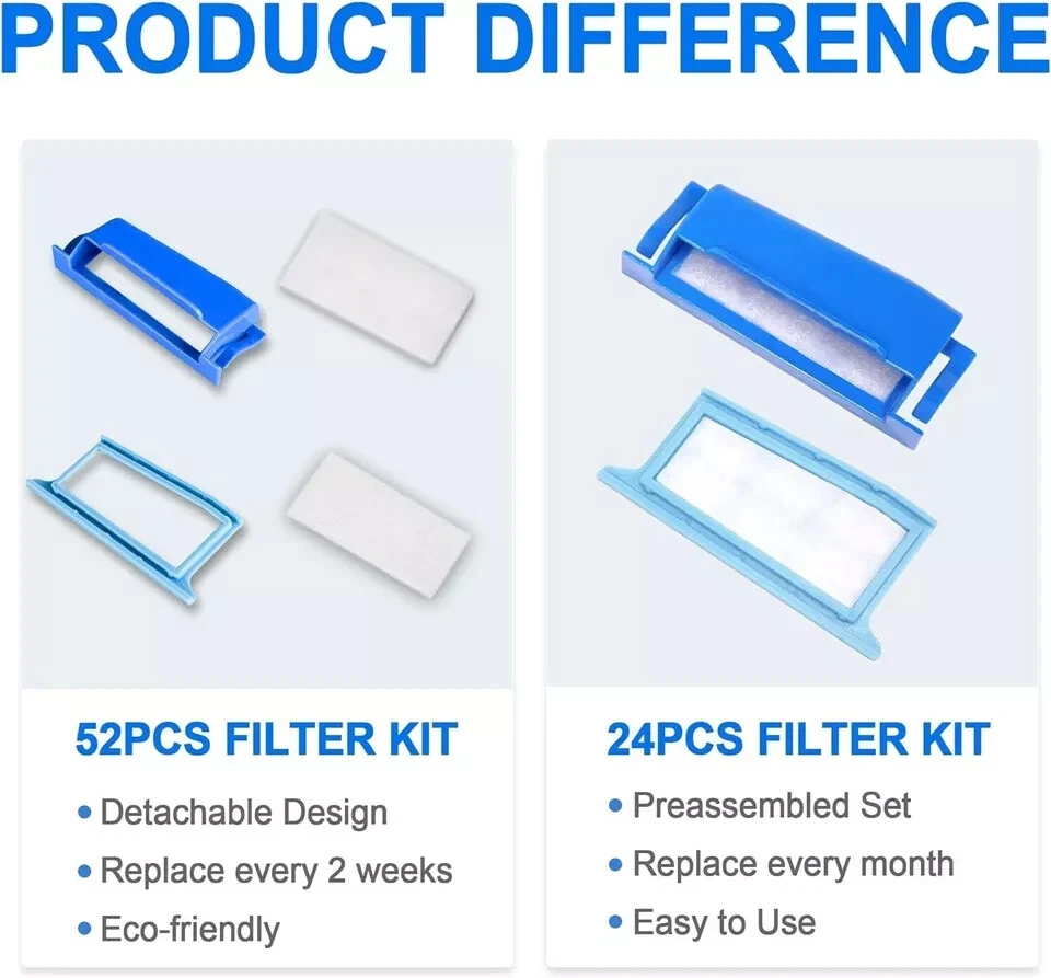 • ➤COST-EFFECTIVE ASSEMBLY FILTER KIT – 26 Pcs Foam Pollen Filters and 26 Pcs Ultra Fine Filters. Include totally 52 Pcs, replace every two weeks is highly recommended, one set satisfy your whole year needs.