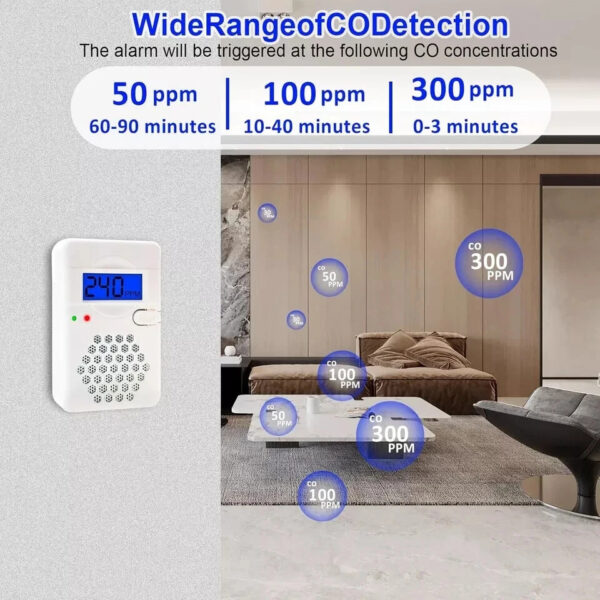- Alarm Standard—30ppm,the display displays the concentration; When the alarm detects that CO concentration exceeds 50ppm , alarm within 60-90 minutes; 100ppm, alarm within 10 to 40 minutes; 300ppm, alarm within 3 minutes. Note: When you test the detector, please do not use gas blow the hole directly.