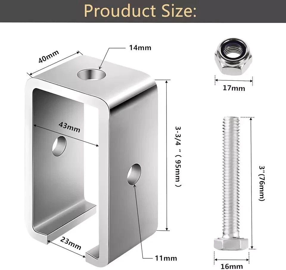 - [Bracket Size]:Strut Channel Bracket upper hole diameter 9/16 inch, side hole diameter 7/16 inch.Height 3-3/4 inches, depth 1-5/8 inches.Our trolley track intermediate support hanger bracket has appropriate dimensions to ensure stable and reliable installation