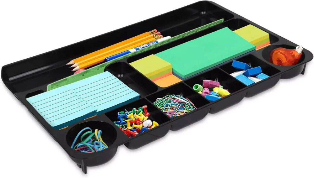- Our black organizer tray adds a touch of elegance to any space. Its sleek and modern design seamlessly blends with any decor, whether it’s in your home office, kitchen, or vanity. Create an organized and visually appealing environment while maintaining a sophisticated aesthetic.