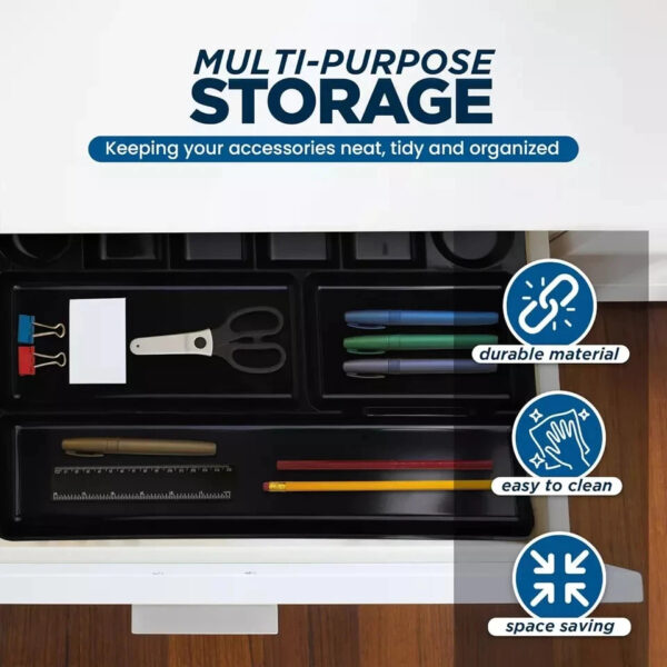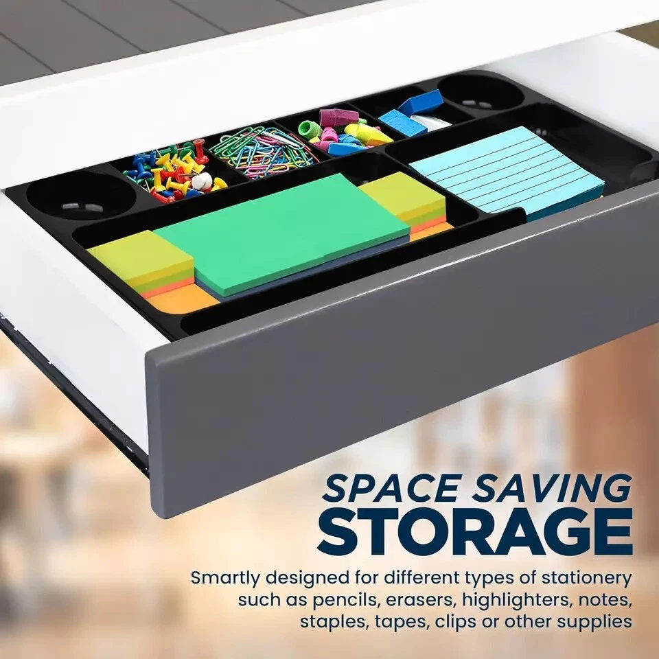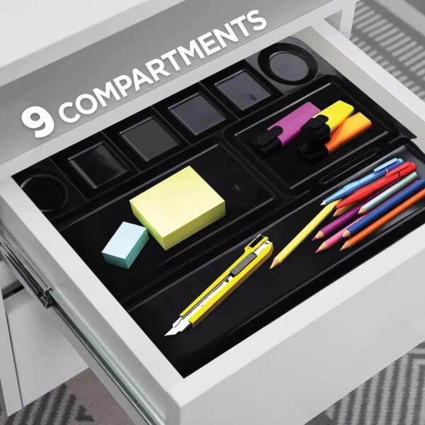 Introducing our versatile Desk Drawer Organizer Tray with 9 Compartments – the ultimate solution for keeping your home office, kitchen, and vanity perfectly organized! This sleek black organizer tray is designed to accommodate a variety of items, making it an essential tool for every meticulous individual.