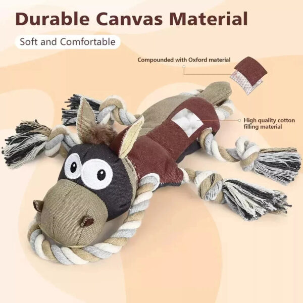 - 【Unique Design】The dog chewy toys are designed in the shape of a donkey, perfect for puppies,small,medium and large dogs. The eyes nose and mouth of the stuffed dog toys are hand embroidered. Compared with other craft, embroidery makes the toy more vivid and extremely long lasting.Besides,IOKHEIRA dog toys are machine washable , not fade or be out of shape.