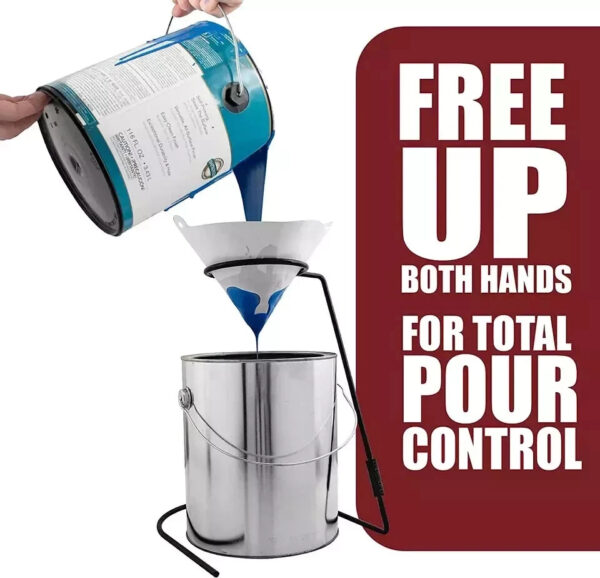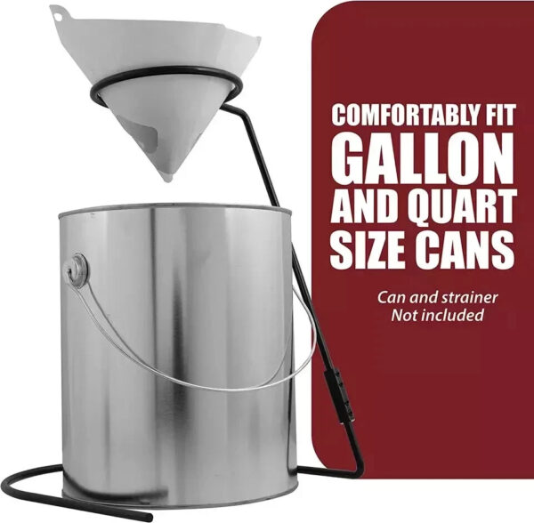 - Made from ¼” rod steel, the stand is perfect for handling paint straining cones and won’t allow the cones to fall through the opening when pouring. Perfect for professionals and beginners, the paint strainer stand can be used in woodworking, automotive, contractor or even DIY applications.