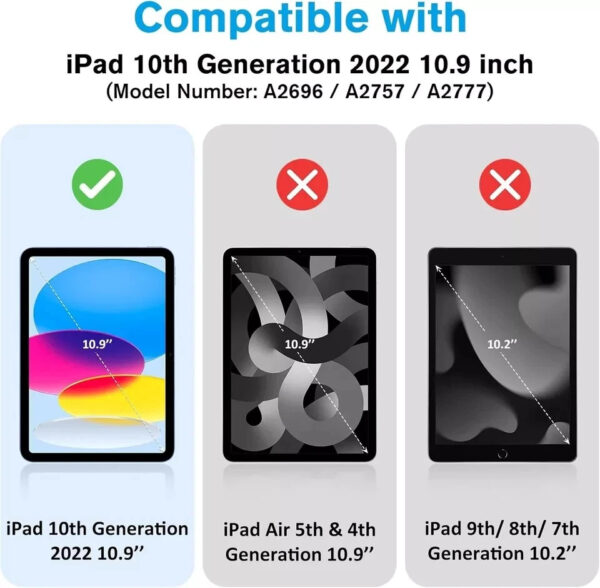 - 【2 Pack Quality Tempered Glass Screen Protector】Only fit for iPad 10th Generation 2022 (10.9 inch), NOT fit for iPad 9th/8th/7th gen 10.2 inch or iPad air/pro series models. Please carefully check the model number at the back of the iPad to find the model (A2757 A2777 A2696).