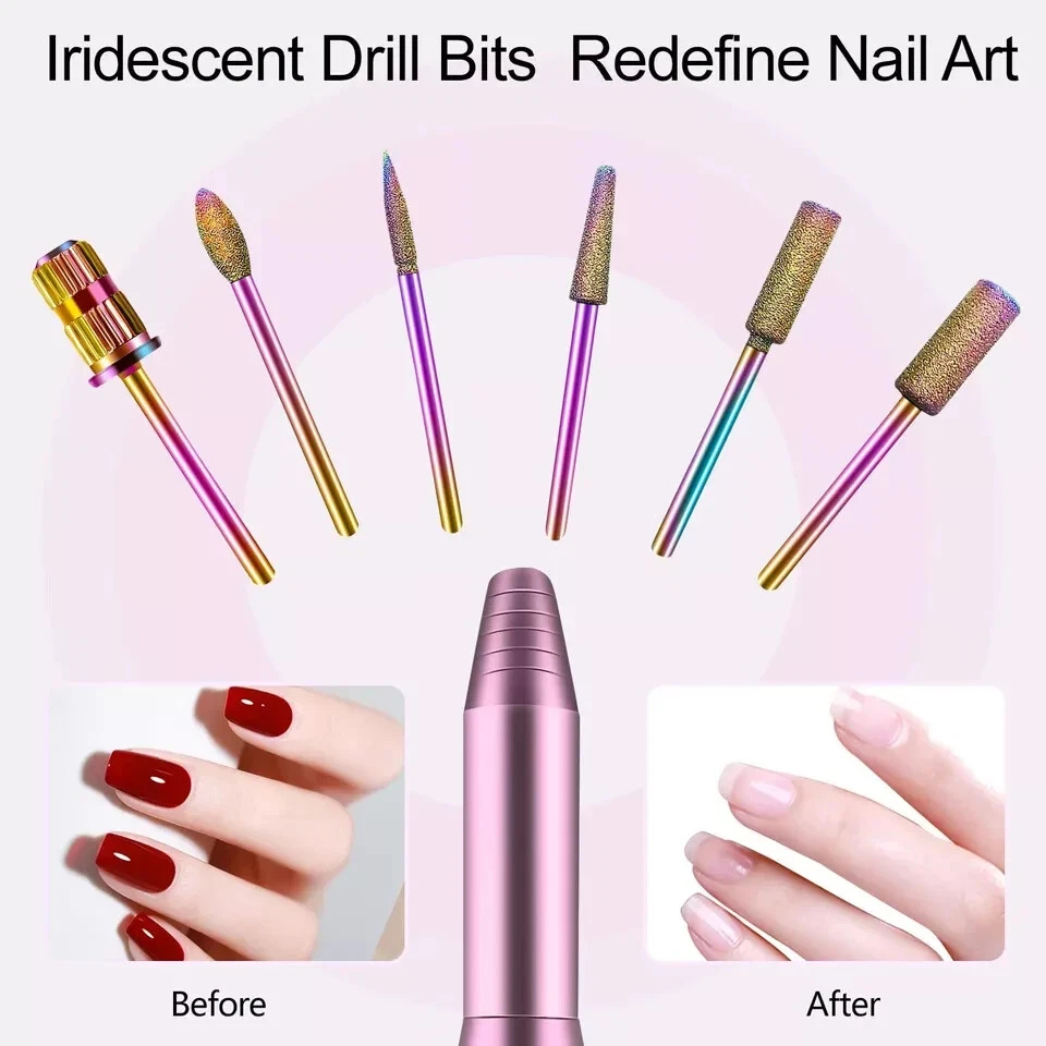 • 【Professional Nail Drill Kit】The nail drill kit include professional acrylic nail drill machine, exquisite iridescent mandrel bit, 5pcs metal bits, 26pcs sanding bands and USB cord. It meets all your need for buffering, grinding, sharpening, sanding, polishing acrylic and gel nails, trimming thick natural toenails, and removing extension gels, cuticle and dead skin.