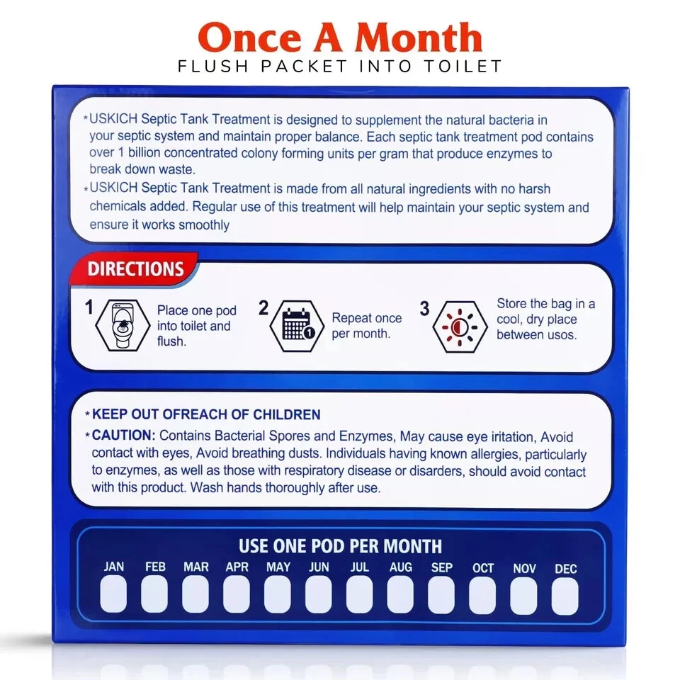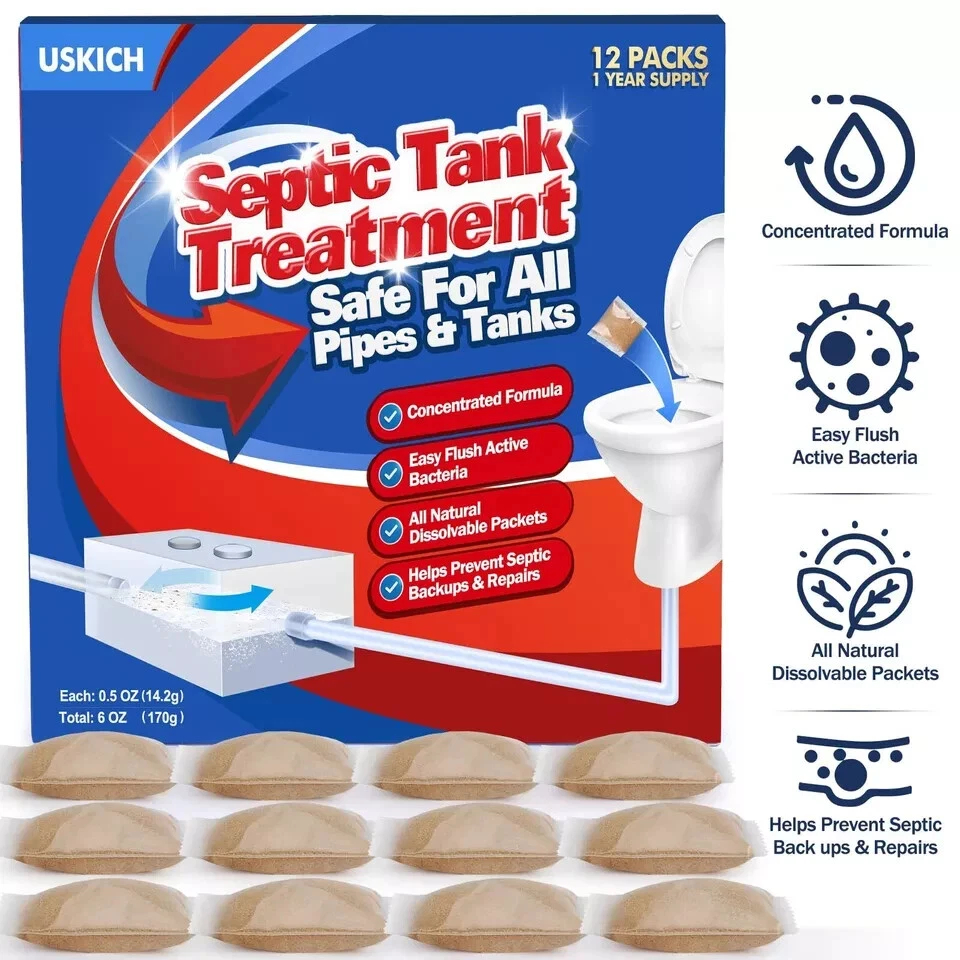 - 🌿Easy Operation: Septic treatment is the easiest and most efficient way to prevent expensive septic tank backups and drain field repairs. You only need to monthly drop a pack into the downstairs toilet bowl and flush the toilet until the pack is swept away. Each pack of septic tank cleaner lasts for 1 month in a septic tank of 1000-1500 gallons, and the 12 packs in total can continuously clean septic tanks for a whole year!