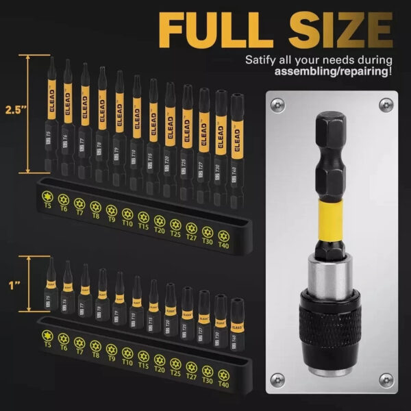 • 【VERSATILE USAGE】This comprehensive kit includes 24+1 impact security torx bits, with sizes ranging from T5 to T40, making it perfect for a wide range of tasks in home repairs, automobiles, and woodworking. The universal 1/4 inch