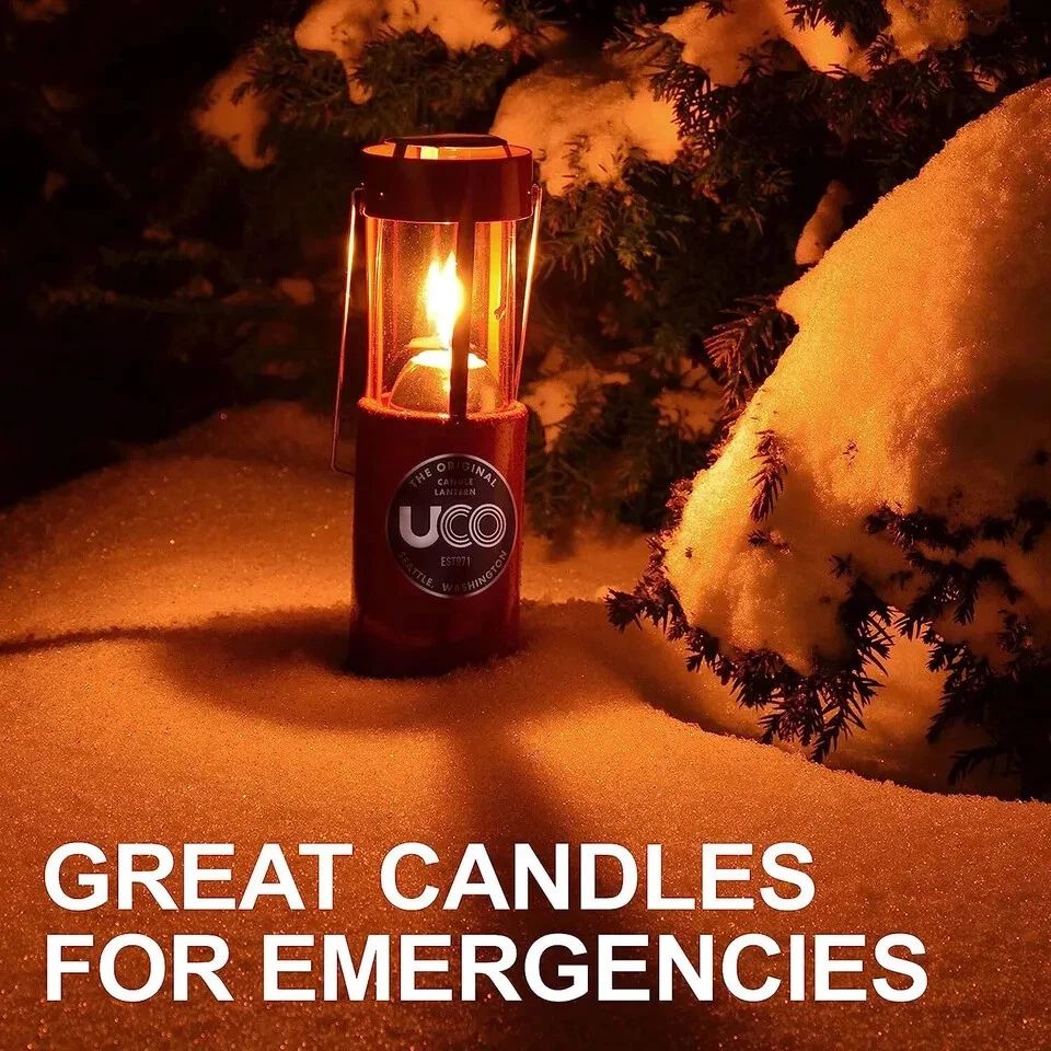 • LONG-BURNING CANDLES: The perfect candles for power outages, these long-lasting candles burn for 12 hours when used in the UCO Original Candle Lantern or Candlelier, or 9 hours outside of a lantern.